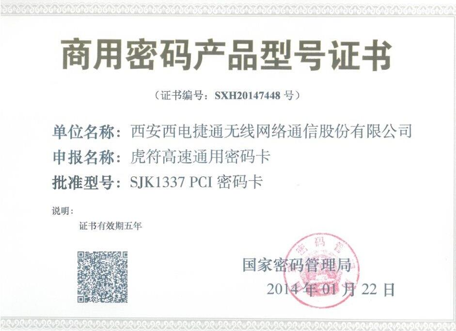 SJY1337系列PCI密碼卡已通過國家商用密碼主管部門鑒定,完全符合密碼設(shè)備相關(guān)規(guī)范,該密碼卡支持國家批準的SM2、SM3、SM4等多種算法,支持真隨機數(shù)產(chǎn)生,支持多進程、多線程應用,支持Linux等主流操作系統(tǒng),提供操作系統(tǒng)內(nèi)核層和應用層API調(diào)用接口。