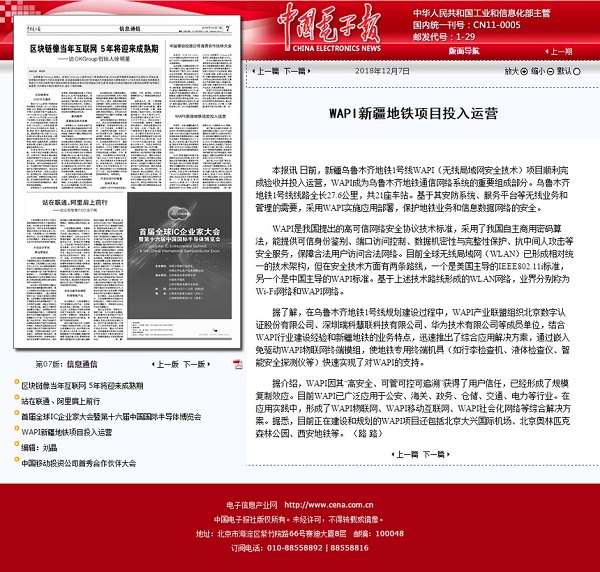 日前,多家媒體報道了新疆烏魯木齊地鐵1號線WAPI項目順利完成驗收并投入運營一事,以下是《中國電子報》的報道: