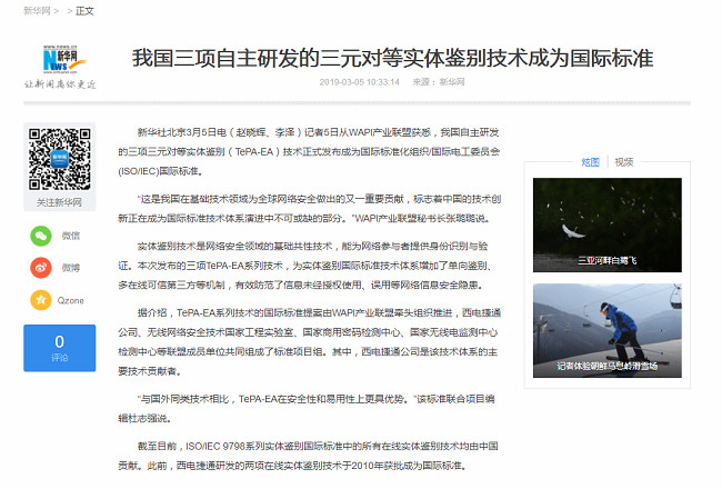 來自新華社:我國三項自主研發(fā)的三元對等實體鑒別技術(shù)成為國際標準