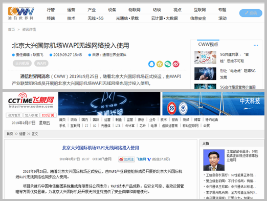 2019年9月25日,隨著北京大興國(guó)際機(jī)場(chǎng)正式投運(yùn),由WAPI產(chǎn)業(yè)聯(lián)盟組織成員開展的北京大興國(guó)際機(jī)場(chǎng)WAPI無線網(wǎng)絡(luò)也同步投入使用。以下是通信世界網(wǎng)等媒體的報(bào)道: